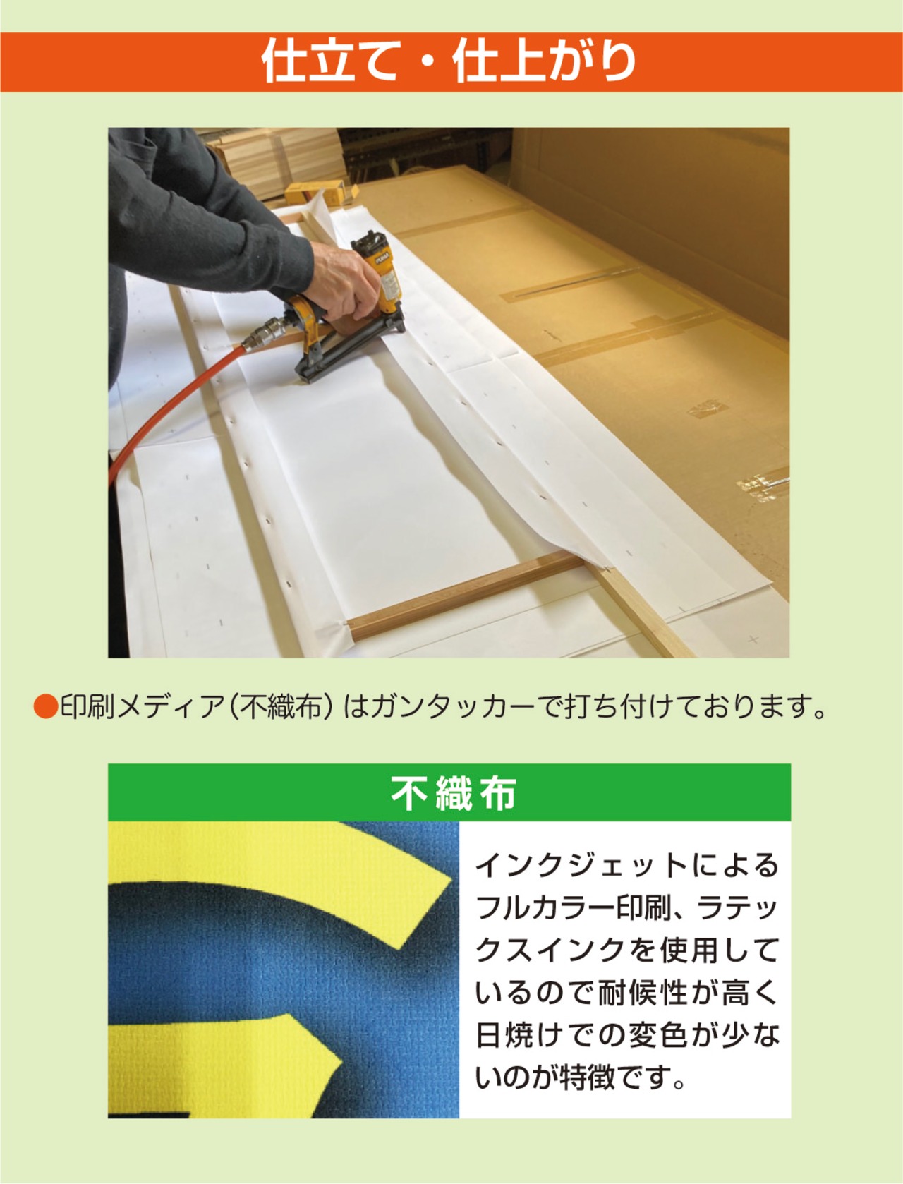 インクジェットプリンターによるフルカラー印刷で美しい仕上がり、木枠に不織布を打ち付けてある商品です。